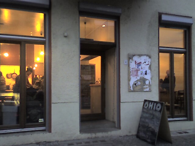 ![]() ![]() ![]() ![]() | Ohio has become a special place for me because so many friends of mine now work there. The cafe is owned by a nice American ex-pat who wisely imported the "american"-style coffee shop model (counter service, relaxed atmosphere). And since I live in Cuvrystr., a street that intersects with schlesi forming the corner closest to the cafe, it's very convenient for me to stop by and say hello to my beautiful friends while they work. The coffee is tasty and bold, and I enjoy drinking it at the counter where you can have a nice chat with Alex while he concocts delicious cakes and savory snacks. There isn't a bulletin board for posting announcements but at the counter you have a raggedy selection of newspapers, magazines and postcards to choose from should you feel like reading. The music is generally good, it depends on who's working. The bathrooms are roomy and private and decorated with more kitsch and humour than the rest of the cafe, which is quite sober but comfortable. Unlike many Berlin cafes, you don't feel pushed into a certain aesthetic. | |